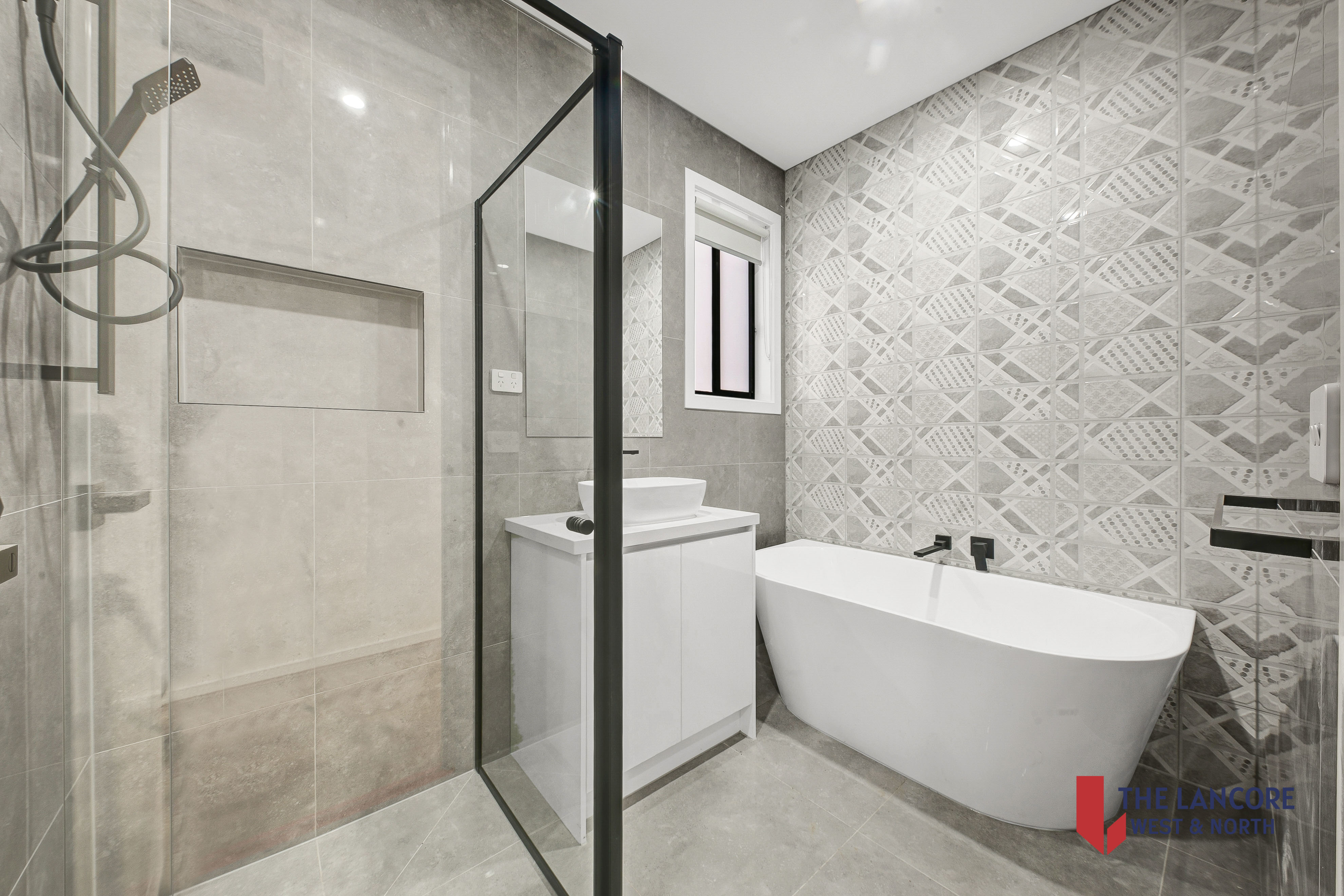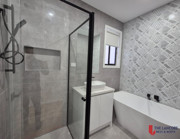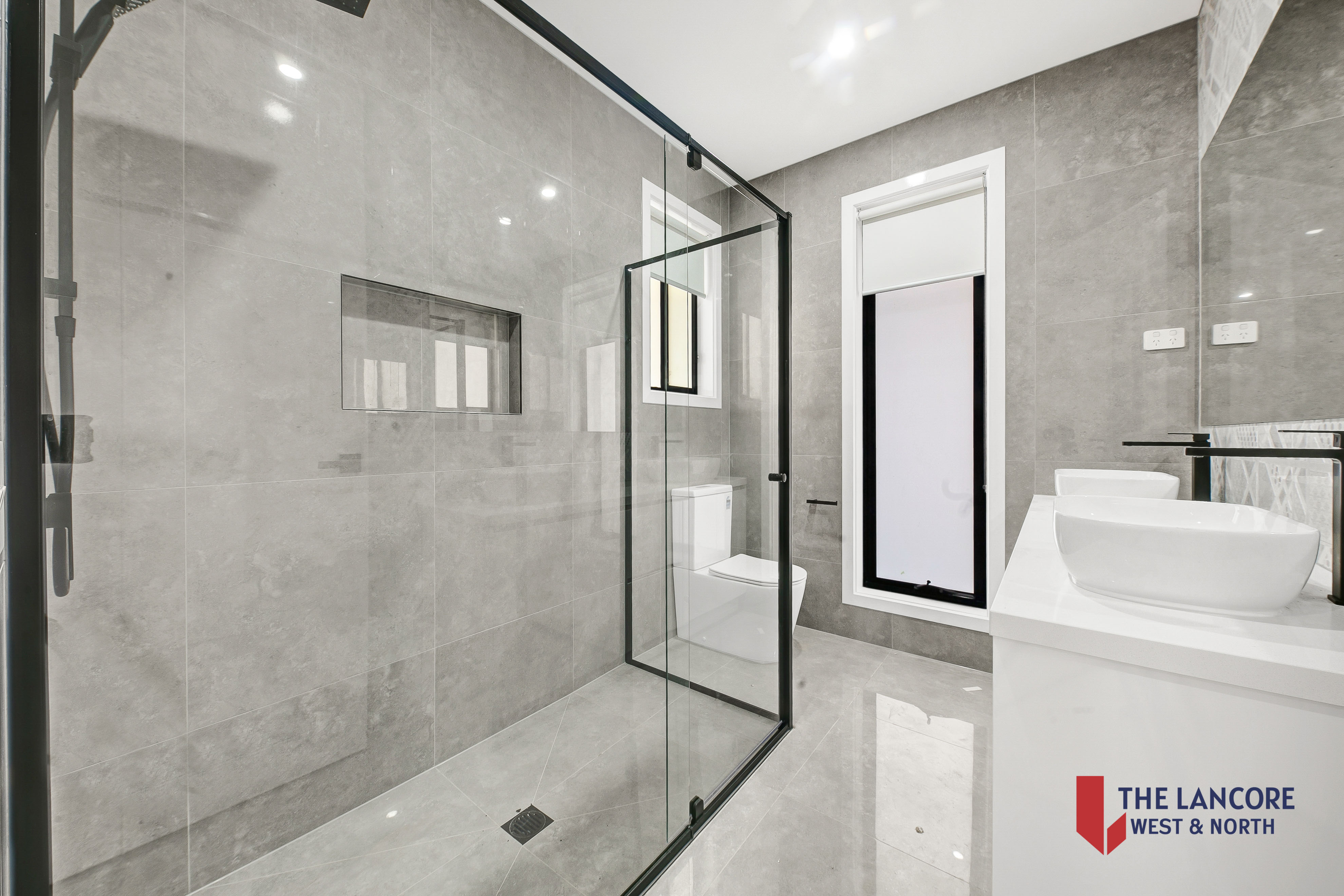Master bedroom with walk-in robe and private ensuite featuring double vanity and rain shower