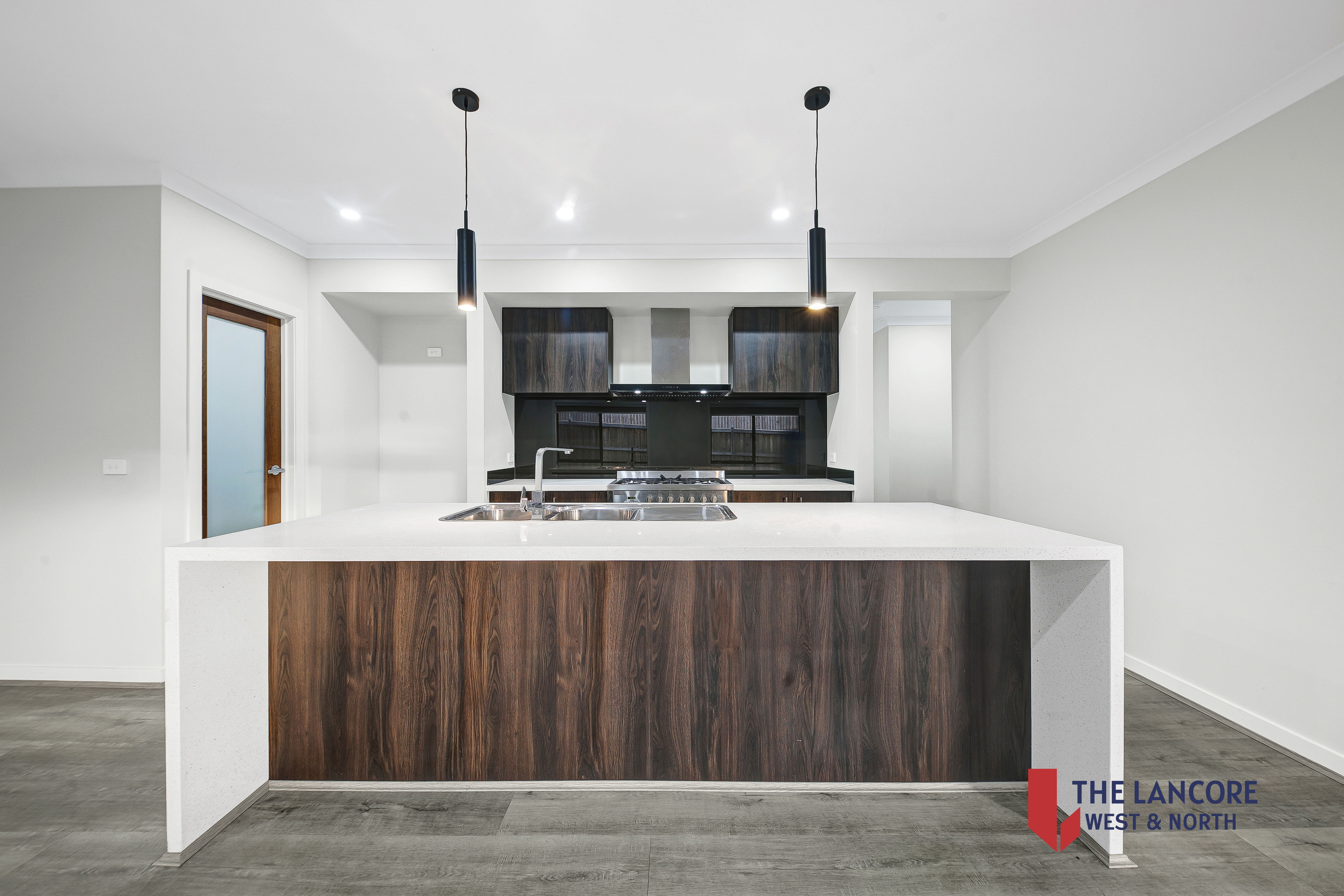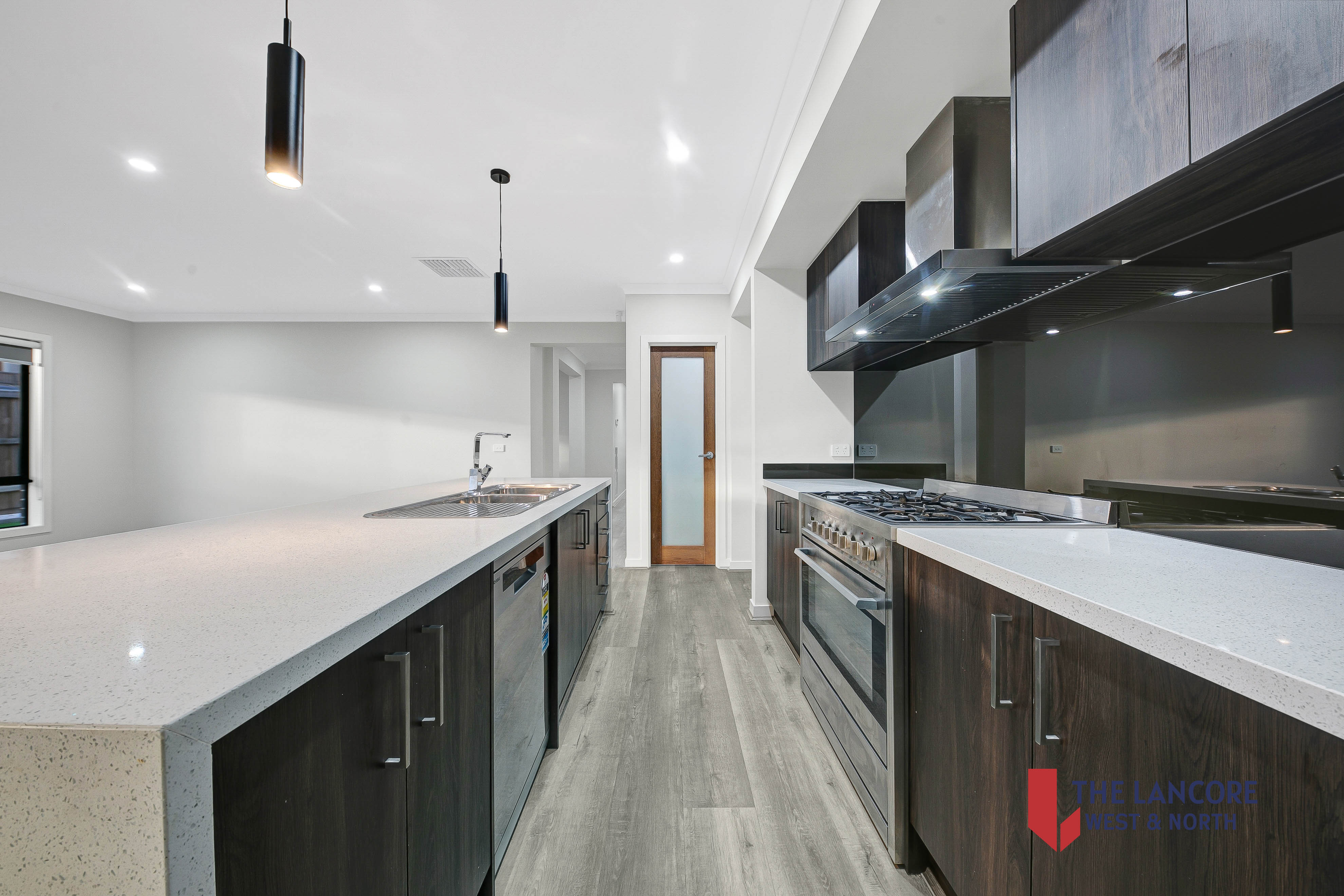 900mm stainless steel appliances, dishwasher, walk-in pantry, and pendant lighting