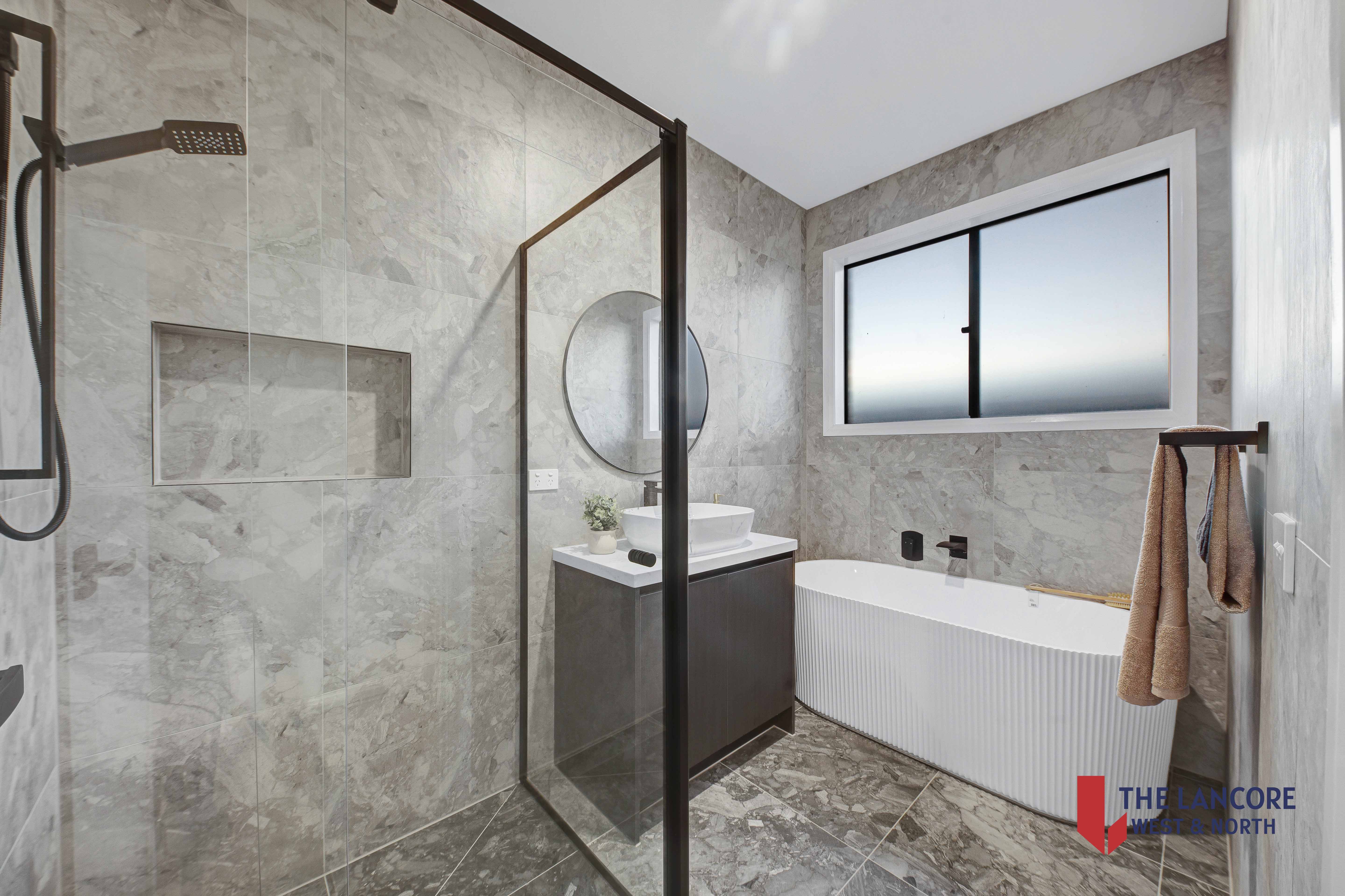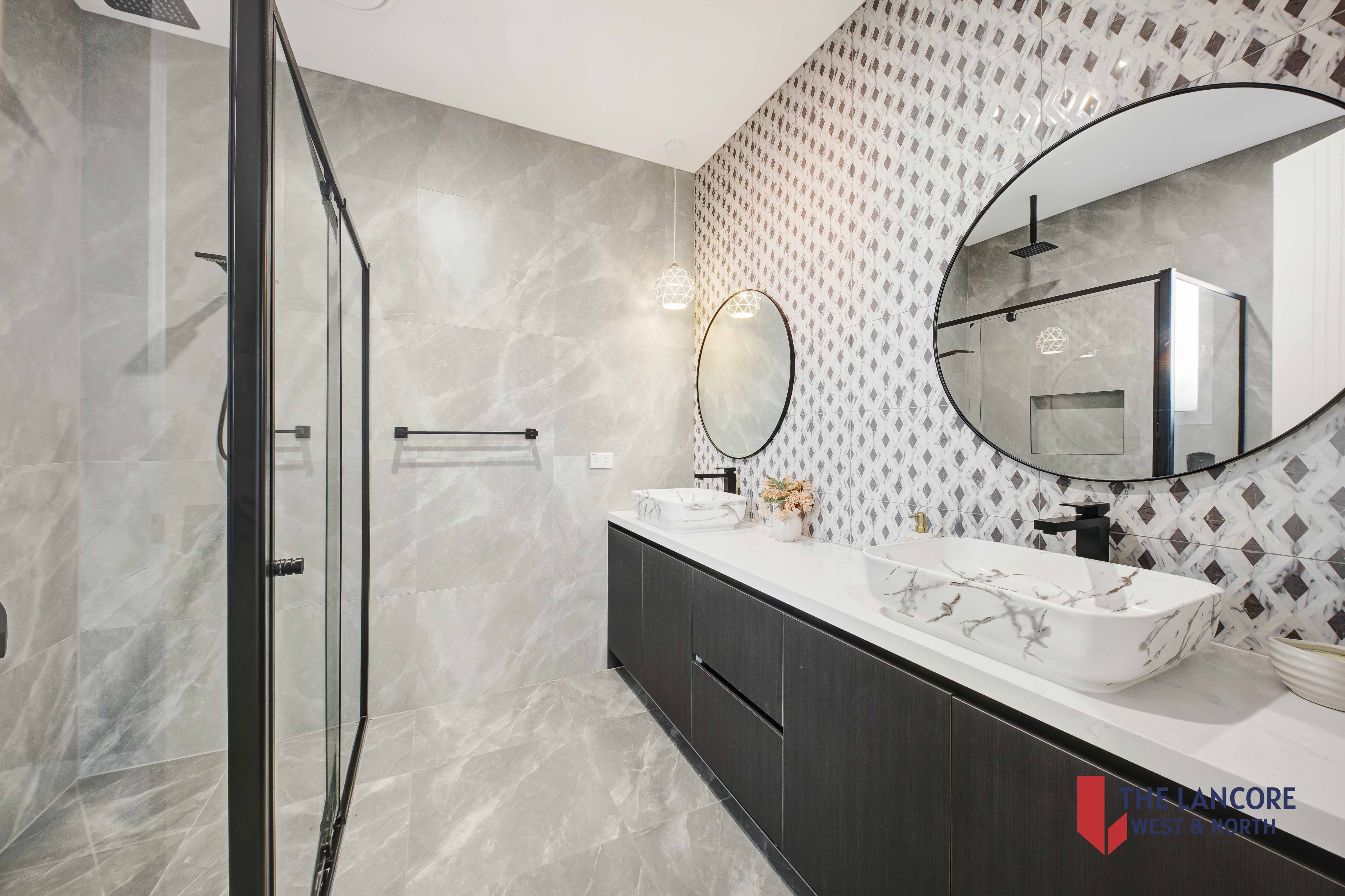 • Bathrooms with floor-to-ceiling tiles and sleek black tapware