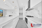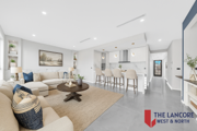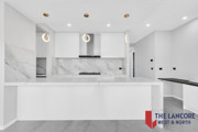 • Ultra-modern kitchen with high-end upgrades, including a bulkhead with three LED pendant lights for a touch of elegance.